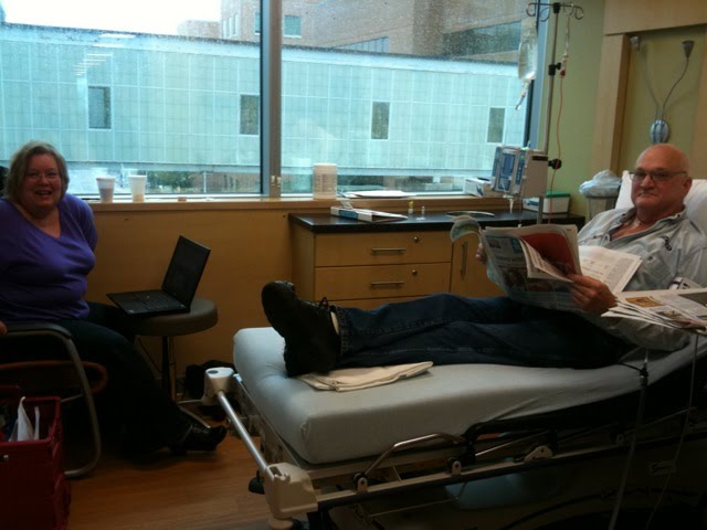Deb and I trudged off into a cold winter-like rain this morning. After labs were processes, we were given a 'go for transplant' tomorrow at 9 am. Hopefully this will be a non-event. However, we've seen enough people have trouble that we respect its possibilities.The bag of chemo was disconnected and so Deb is 'Free at last!'